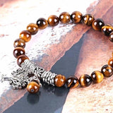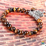 Ce bracelet est fait de perles d'Oeil de Tigre montées sur élastique et d'un pendentif représentant l'arbre de vie.
