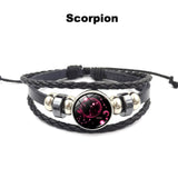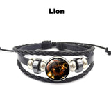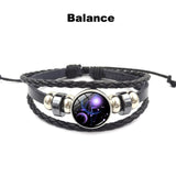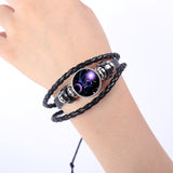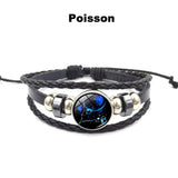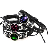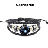 Ce bracelet fait de cuir est orné d'une pastille de verre représentant les constellations du zodiaque.