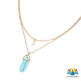 Ce joli pendentif "Pierre de Lune" est ornée d'une pierre naturelle semi-précieuse taillée en forme géométrique et montée sur chaîne à billes, doublée d'un pendentif au motif Lune.